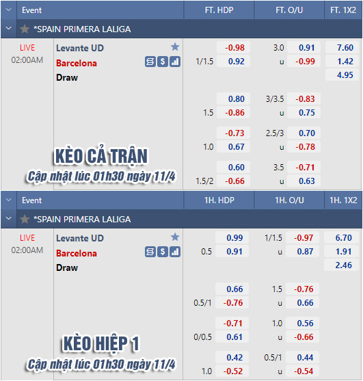 * Chốt kèo trận Levante vs Barcelona (02h00 ngày 11/4)