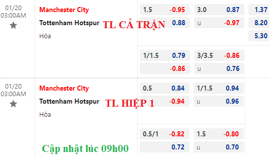 Trên sàn châu Á, Man xanh mất giá trầm trọng khi từ chấp 1 1/2 về 1 1/4 bỏ sâu trong bối cảnh tài xỉu vẫn giữ nguyên. Tuy vậy thì kèo hiệp 1 chủ vẫn chấp hòa cho thấy khả năng MC vẫn sẽ sáng cửa dẫn trước, nhưng khó thắng cách biệt cả trận.
