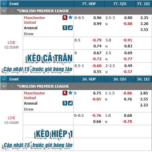 AEGoal.net chốt kèo trực tiếp trận Man Utd vs Arsenal diễn ra lúc 02h00 ngày 01/10 sau khi dựa trên tính toán, chuyển động về kèo châu Á và đội hình ra sân của 2 đội.