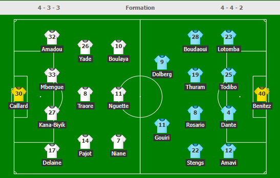 Đội khách vẫn tung ra sân đội hình mạnh nhất với Dolberg và Gouiri đá cặp tấn công, còn Thuram, Rosario, Stengs đá phía dưới. Với chiến thuật như vậy của đôi bên, việc tài xỉu có phần suy giảm khiến kịch bản cởi mở khó xuất hiện.