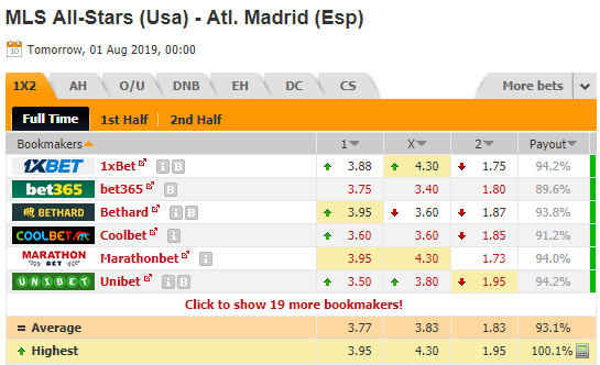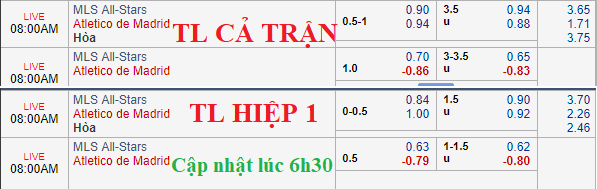 Sau khi đôi bên công bố đội hình ra sân, kèo chấp 3/4 của Atletico Madrid duy trì từ thời điểm tối qua (31/07) đã chứng kiến lợi nhuận tăng vọt cho cửa trên. Theo đó, điểm ăn cho cửa Atletico lên cao và cân bằng hơn với cửa MLS All-Stars, thậm chí còn có xu hướng nhích lên mức 1.00. Trong khi đó, mốc tài xỉu vẫn là 3 1/2 nhưng điểm ăn cho cửa tài đã tăng lên so với thời điểm tối ngày 31/7.