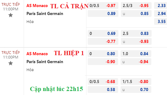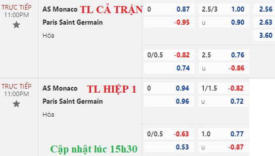 Sàn châu Á ghi nhận đà tăng giá của Monaco khi họ lên chấp đồng banh. Đó là tín hiệu rất tích cực với CLB xứ Công quốc vì đã rất lâu rồi tại Ligue 1 không có đội nào sắm vai cửa trên khi đụng độ PSG. Mức tài xỉu 2 3/4 ghi nhận điểm ăn ở cửa tài bỏ sâu, đó là điều hợp lý khi PSG vắng cả Messi lẫn Mbappe.