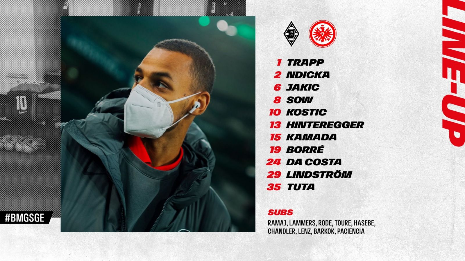 Eintracht Frankfurt: Trapp; Tuta, Hinteregger, N'Dicka; Costa, Jakic, Sow, Chandler; Kamada, Kostic; Borre