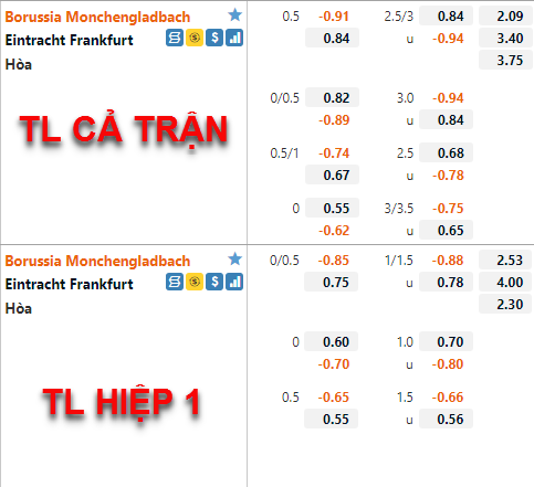 Tỷ lệ chấp của đội chủ nhà gần như không có biến động nào đáng kể so với thời điểm chúng tôi cập nhật trưa nay. Monchengladbach vẫn được duy trì tỷ lệ chấp chính ở mức 1/2 và điểm ăn gần như không có thay đổi. Trong khi đó tỷ lệ tài xỉu có những biến động rõ ràng khi mốc 3 hoà đã được đẩy lên làm mốc chính của trận đấu thay cho mức 2 3/4 trước đây.