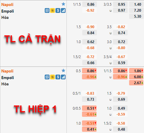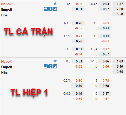 Tỷ lệ chấp của Napoli có xu hướng giảm điểm thời gian vừa qua. Hiện tại mốc tỷ lệ chấp chính của trận đấu đã được nhà cái châu Á keo xuống mức 1 1/4 từ mức 1 1/2 ở lần chúng tôi cập nhật sáng nay. Trong khi đó bên phía tỷ lệ tài xiu lại không có nhiều biến động, mốc 3 1/4 vẫn là mốc chính và điểm ăn gần như không có thay đổi nào đáng kể.