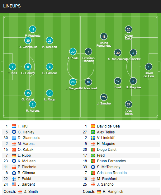 Man Utd: De Gea; Dalot, Lindelof, Maguire, Telles; Fred, McTominay; Fernandes, Sancho; Ronaldo, Rashford