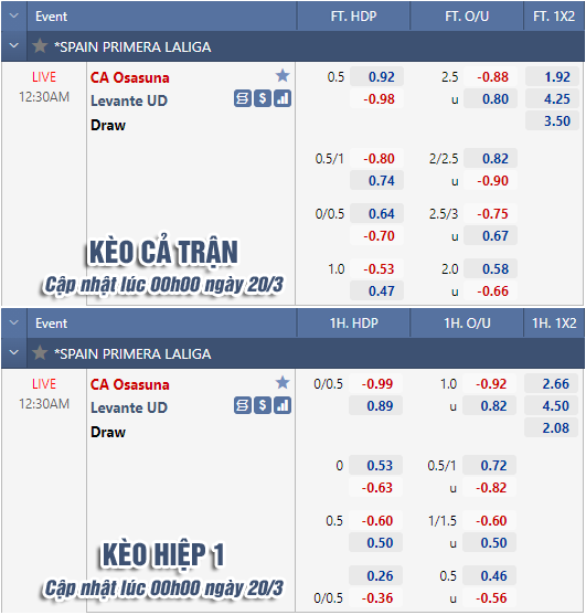 * Chốt kèo trận Osasuna vs Levante (00h30 ngày 20/3)