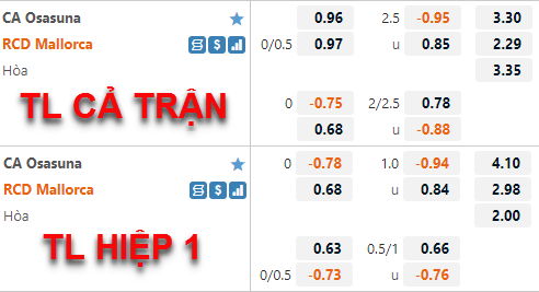 Mallorca tiếp tục duy trì tỷ lệ chấp 1/4 như thời điểm chúng tôi cập nhật lần trước nhưng hiện tại điểm ăn của đội khách đã được điều chỉnh tăng. Bên phía tỷ lệ tài xỉu có những biến động rõ rệt hơn khi mốc chính 2 1/2 trước đây đã được thay thế bằng mốc 2 1/4 ở thời điểm hiện tại.
