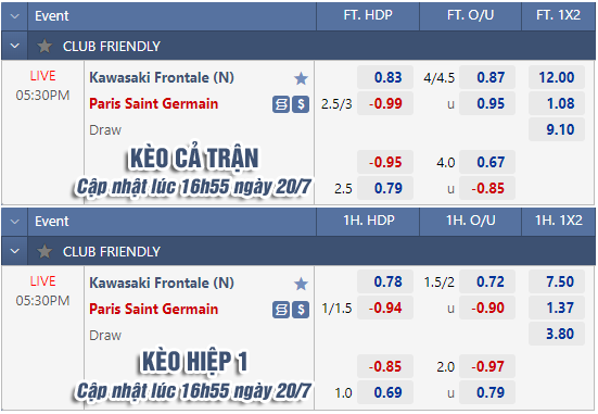* Chốt kèo trận PSG vs Kawasaki Frontale (17h30 ngày 20/07)