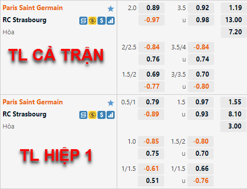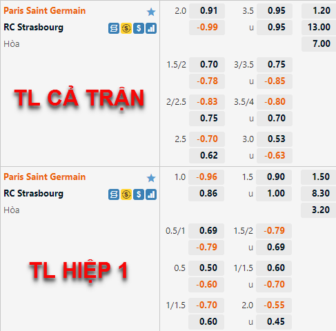 Tỷ lệ của trận đấu không có nhiều biến động so với lần chúng tôi cập nhật gần nhất. Mức chấp 1 1/2 của PSG tiếp tục được giữ là mốc chấp chính, điểm ăn của cửa trên được điều chỉnh tăng nhưng không nhiều. Tương tự bên phía tỷ lệ tài xỉu, mốc 3 1/2 đang là mức tài xỉu chính và điểm ăn của cửa tài được điều chỉnh tăng đôi chút.