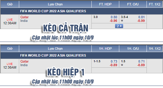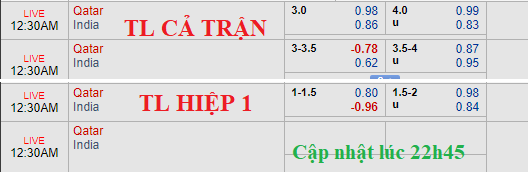 So với phiên khớp lệnh lúc 11h sáng nay thì Qatar vẫn duy trì được kèo chấp 3 hòa nhưng điểm ăn cho cửa chủ nhà đã tăng từ mức 0.80 lên thành 0.98 trước giờ bóng lăn chừng 45p. Điều đáng nói là mốc tài xỉu lại nhích từ 3 3/4 lên thành 4 hòa với lợi nhuận cao hơn ở cửa tài.