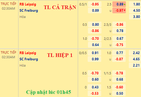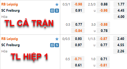 So với sáng ngày 9/11 thì RB Leipzig vẫn chấp 3/4 cùng điểm bỏ, nhưng tài xỉu đã có dịch chuyển đáng kể từ 2 3/4 về còn 2 1/2. Rõ ràng, việc Freiburg chơi chặt chẽ khiến trận cầu này khó xuất hiện kịch bản tưng bừng.