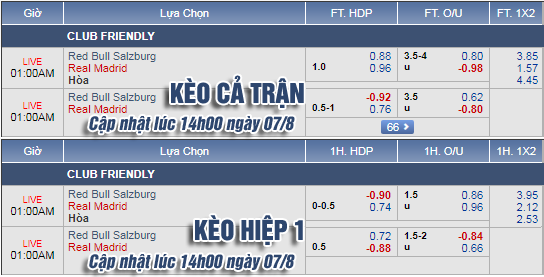 AEGoal.net chốt kèo trực tiếp trận RB Salzburg vs Real Madrid diễn ra lúc 00h00 ngày 08/8 sau khi dựa trên tính toán, chuyển động về kèo châu Á và đội hình ra sân của 2 đội.