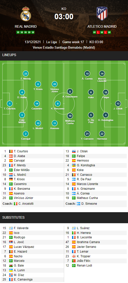 AEGoal chốt kèo bóng đá trực tiếp trận Real Madrid vs Atletico Madrid diễn ra lúc 03h00 ngày 13/12 trong khuôn khổ giải VĐQG Tây Ban Nha sau khi dựa trên tính toán, chuyển động về kèo châu Á và đội hình ra sân của 2 đội.