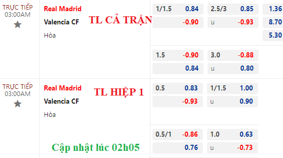Trên sàn châu Á, Real Madrid vẫn duy trì kèo chấp 1 1/4 và điểm ăn cho họ còn có phần thấp hơn chiều 2/2. Trong khi ấy thì tài xỉu 3 hòa lại bị kéo về còn 2 3/4. Với đội hình thiếu một vài trụ cột, việc Real duy trì kèo chấp như vậy là tín hiệu khả quan cho họ. Valencia thực tế phong độ cũng thất thường và chất lượng nhân sự cũng yếu kém.