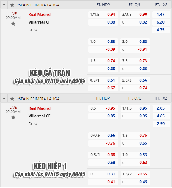 * Chốt kèo trận Real Madrid vs Villarreal (02h00 ngày 09/4)