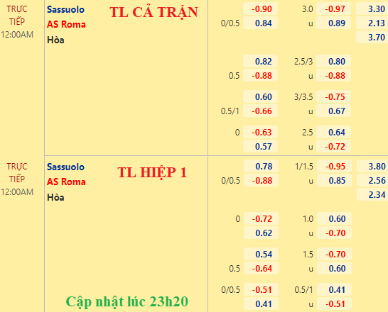 Tỷ lệ chính vẫn dao động giữa mức khách chấp đồng banh và chấp hòa. Trong bối cảnh hiệp 1 AS Roma cũng chấp 1/4, kèo châu Á như vậy là khả quan với các vị khách, nhất là trong bối cảnh tài xỉu 3 hòa có dấu hiệu giảm điểm ở cửa xỉu.