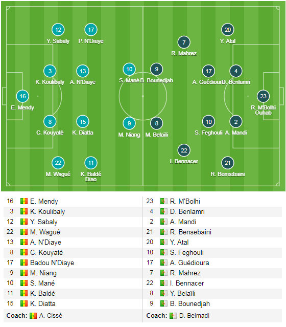 Không nằm ngoài dự đoán, cả 2 đội đều đã tung ra đội hình mạnh nhất của mình ở cuộc đụng độ này, bên phía Senegal chắc chắn Sadio Mane là cái tên đang được trông đợi nhiều nhất, trong khi phía Algeria là Riyad Mahrez. Mặc dù vậy, cả 2 đội cũng đã cho thấy sự thận trọng của mình bằng việc sử đụng đội hình thiên về sự chắc chắn cho cuộc đụng độ tới đây là 4-4-2, điều này cũng tiếp thêm hy vọng cho những ai đặt niềm tin vào mốc dưới bàn thắng của trận đấu.