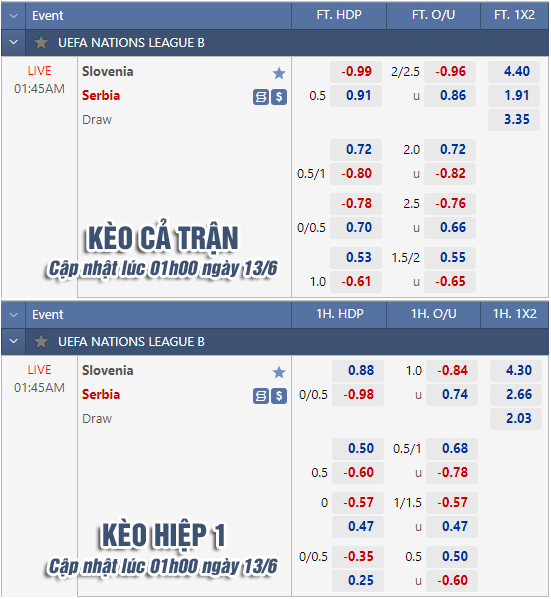 * Chốt kèo trận Slovenia vs Serbia (01h45 ngày 13/6)