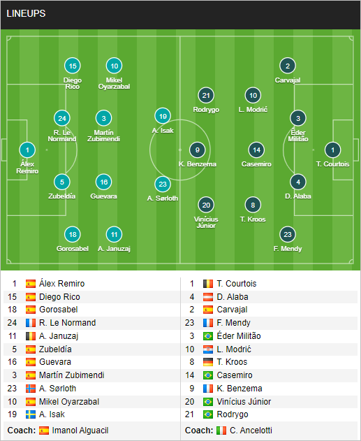 AEGoal chốt kèo bóng đá trực tiếp trận Sociedad vs Real Madrid diễn ra lúc 03h00 ngày 5/12 trong khuôn khổ giải VĐQG Tây Ban Nha sau khi dựa trên tính toán, chuyển động về kèo châu Á và đội hình ra sân của 2 đội.