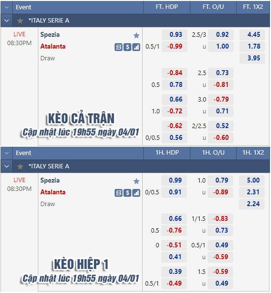 * Chốt kèo trận Spezia vs Atalanta (20h30 ngày 04/1)