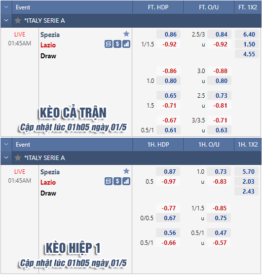 * Chốt kèo trận Spezia vs Lazio (01h45 ngày 01/5)
