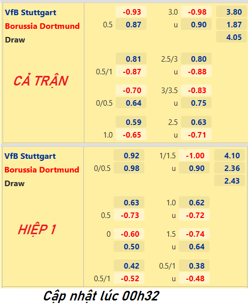 AEGoal chốt kèo bóng đá trực tiếp trận Stuttgart vs Dortmund diễn ra lúc 01h30 ngày 9/4 trong khuôn khổ VĐQG Đức sau khi dựa trên tính toán, chuyển động về kèo châu Á và đội hình ra sân của 2 đội.