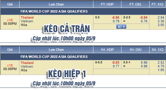 AEGoal.net chốt kèo trực tiếp trận Thái Lan vs Việt Nam diễn ra lúc 19h00 ngày 05/9 sau khi dựa trên tính toán, chuyển động về kèo châu Á và đội hình ra sân của 2 đội.