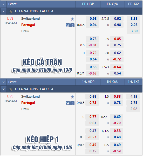 * Chốt kèo trận Thụy Sĩ vs Bồ Đào Nha (01h45 ngày 13/6)