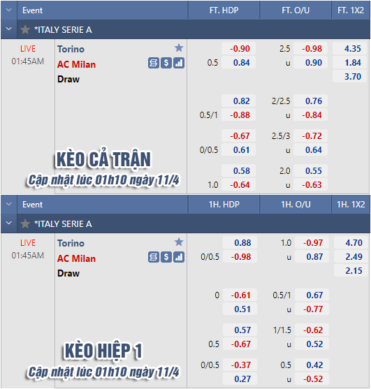 * Chốt kèo trận Torino vs AC Milan (01h45 ngày 11/04)