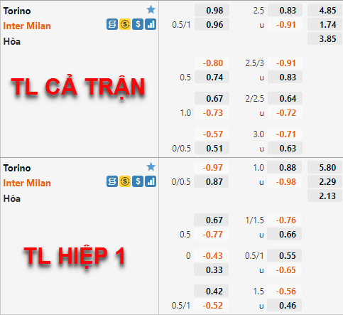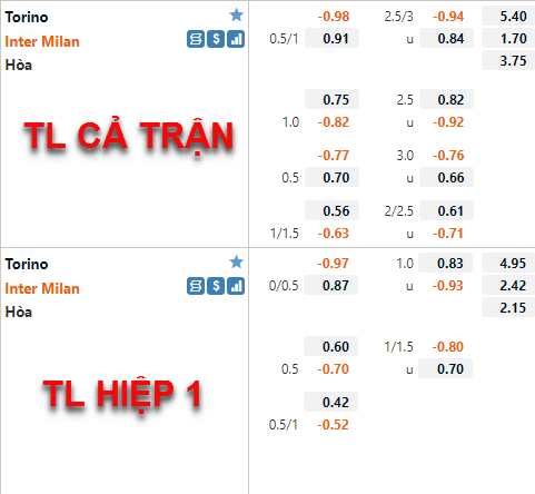 Tỷ lệ chấp của Inter Milan vẫn được nhà cái châu Á giữ ở mức 3/4 như thời điểm chúng tôi cập nhật trước đây, điểm ăn của cửa trên đã được điều chỉnh tăng nhưng không nhiều. Tương tự bên phía tỷ lệ tài xỉu của trận đấu cũng không có nhiều biến động, mốc 2 3/4 và điểm ăn ít bên phía cửa xỉu vẫn được duy trì là mốc chính của trận đấu, điểm ăn 2 cửa không có nhiều khác biệt so với trước đây.