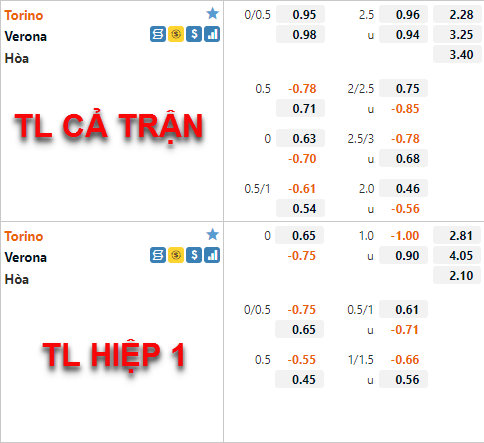 Hiện tại đội chủ nhà Torino vẫn đang có tỷ lệ chấp chính là 1/4 như thời điểm chúng tôi cập nhật trưa nay và điểm ăn của 2 cửa cũng không có nhiều biến động so với trước đây. Bên phía tỷ lệ tài xỉu cũng có những diễn biến tương tự khi mốc 2 1/2 vẫn là mốc chính của trận đấu và điểm ăn cũng gần như không có biến động nào.