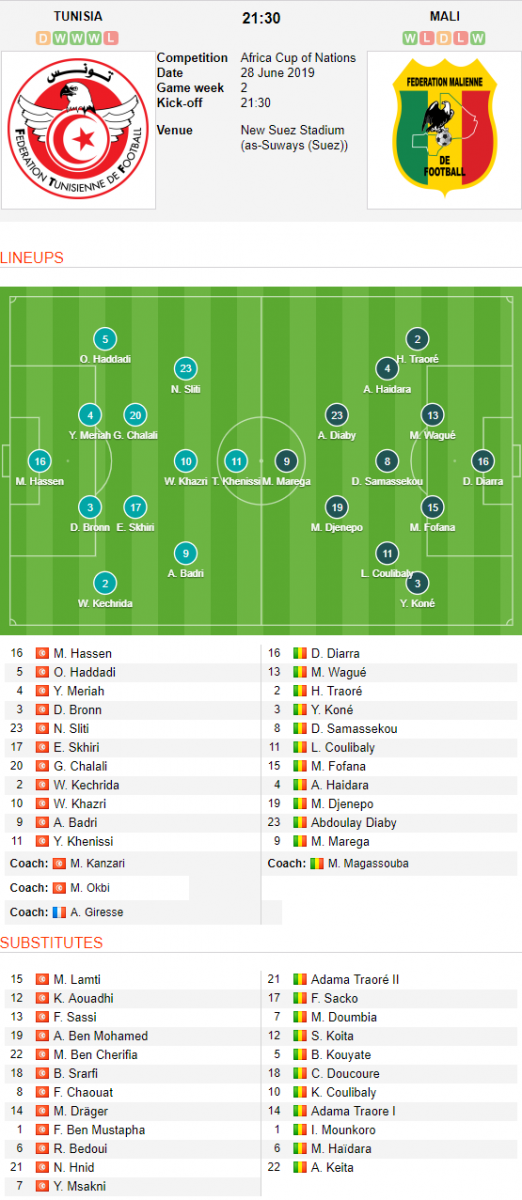 Mali (4-2-3-1): Diarra - Traore, Wague, Fofana, Kone - Samassekou, Coulibaly - Diaby, Traore, Djenepo - Marega
