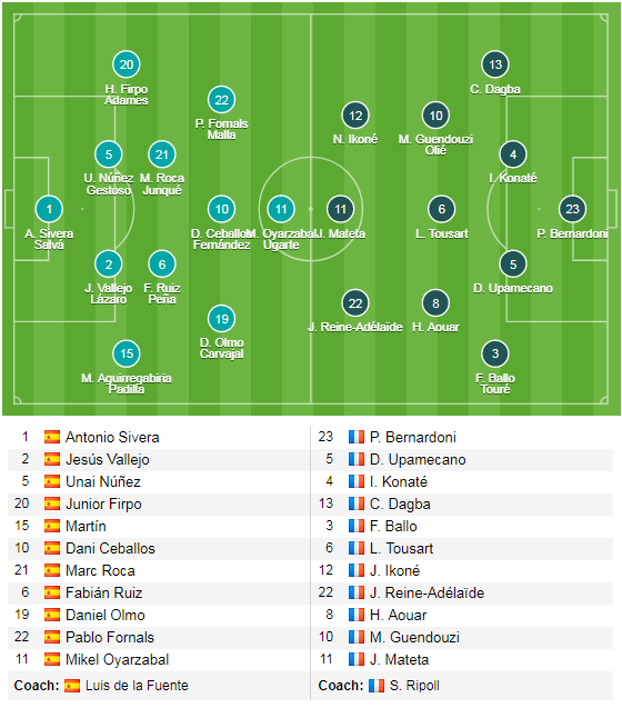 U21 Tây Ban Nha (4-2-3-1): Sivera - Martin, Vallej, Mere, Aduirregabiria - Roca, Ruiz - Fornals, Ceballos, Olmo - Oyarzabal
