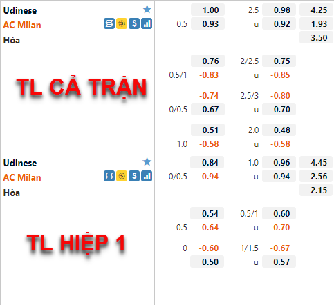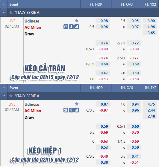 AEGoal chốt kèo bóng đá trực tiếp trận Udinese vs AC Milan diễn ra lúc 02h45 ngày 12/12 trong khuôn khổ giải VĐQG Italia sau khi dựa trên tính toán, chuyển động về kèo châu Á và đội hình ra sân của 2 đội.