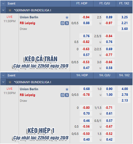 * Chốt kèo trận Union Berlin vs RB Leipzig (23h30 ngày 20/8)