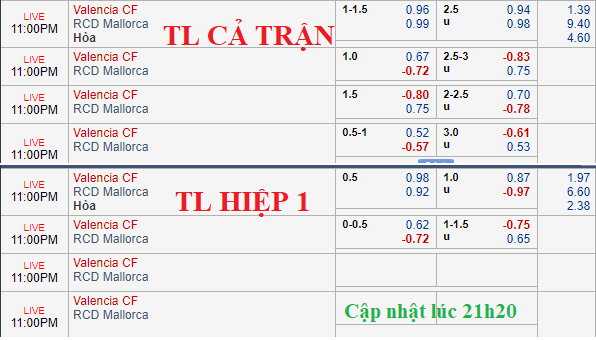 Mức handicap của trận đấu không thay đổi so với thời điểm 10h sáng nay, Valencia vẫn chấp 1 1/4, chỉ có điều lợi nhuận cho 2 cửa đã cân bằng hơn. Điều đáng nói là mức tài xỉu 2 3/4 lại bị điều chỉnh về chỉ còn 2 1/2 với lợi nhuận cân bằng cho 2 cửa. Đây là điểm đáng lưu tâm về sự biến động tỷ lệ.