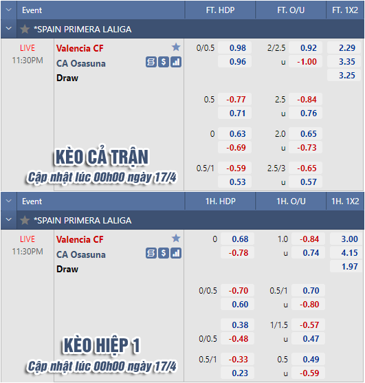* Chốt kèo trận Valencia vs Osasuna (23h30 ngày 16/4)