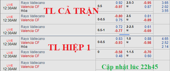 Valencia vẫn giữ được kèo chấp hòa nhưng lợi nhuận cho cửa trên của họ đã thay đổi theo chiều hướng thiếu tích cực, từ mức 0.94 lúc 09h00 sáng 06/04 thành -0.97 trước giờ bóng lăn 45 phút. Trong khi đó, mốc tài xỉu 2 1/2 lại được kéo lên thành 2 3/4 với điểm bỏ đôi chút (-0.95) cho cửa tài.