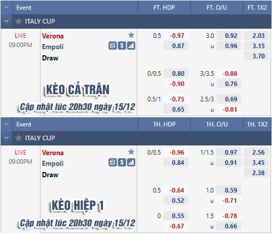 CHỐT KÈO trực tiếp trận Verona vs Empoli, 21h00 ngày 15/12: Cúp QG Italia