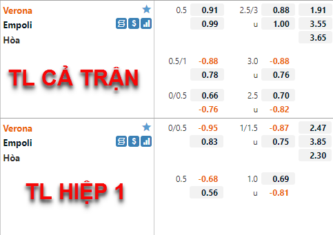 Với một số thay đổi trong đội hình, Verona đang tỏ ra không thực sự đáng tin so với Empoli ở ở trận này. Trên sàn giao dịch châu Á, điều đó đã được thể hiện khi Verona vẫn duy trì mức chấp 1/2, thế nhưng điểm ăn của Verona đã tăng khá mạnh và đã tiến đến mức bỏ.