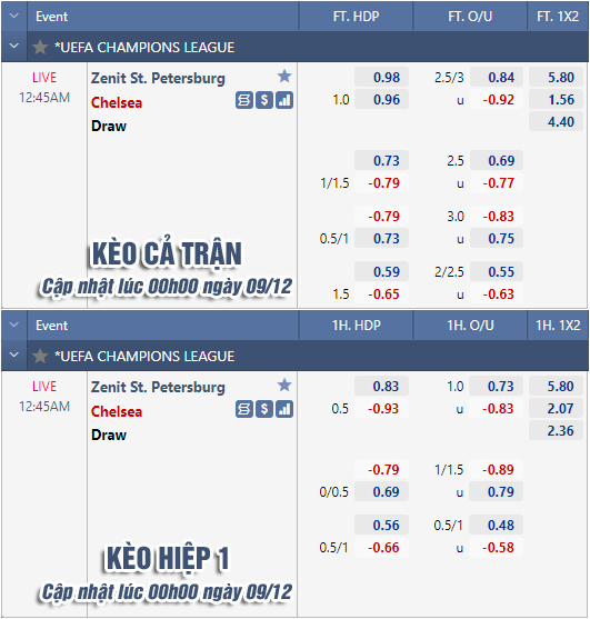 * Chốt kèo trận Zenit vs Chelsea (00h45 ngày 9/12)