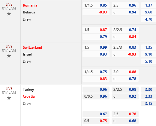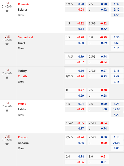 * Romania vs Belarus: Gần như không có dịch chuyển nào đáng kể khi Romania vẫn chấp 1 thua nửa cả trận và chấp hòa trong hiệp 1, còn tài xỉu vẫn là 2 1/2 cùng điểm ăn cân bằng giữa các lựa chọn. Kèo châu Á đó khả quan với Romania trong bối cảnh khách yếu và không để lại dấu ấn gì thời gian gần đây.
