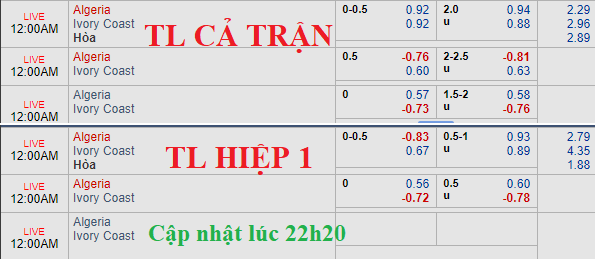 So với phiên khớp lệnh lúc 11h sáng nay thì mức handicap không có dịch chuyển đáng kể. Algeria vẫn giữ được mức chấp đồng banh và điểm ăn cho 2 cửa tương đối cân bằng. Trong khi đó, mức tài xỉu dù giữ nguyên 2 hòa nhưng điểm ăn cho cửa xỉu lại tăng khá mạnh từ 0.71 lên thành 0.88. Điều này cho thấy có không ít nhà đầu tư tin tưởng vào kịch bản cởi mở.