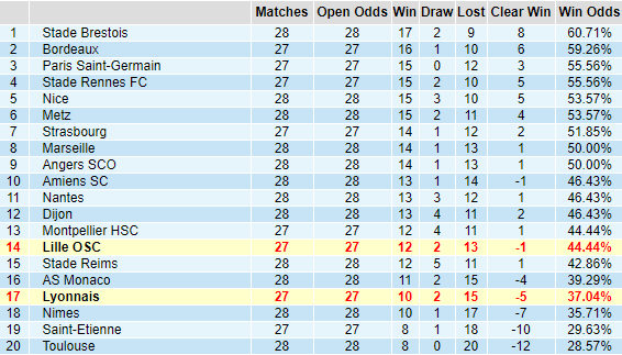 BXH tỷ lệ châu Á tại Ligue 1 mùa bóng 2019/2020