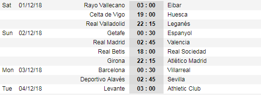 Lịch thi đấu vòng 14 La Liga Tây Ban Nha