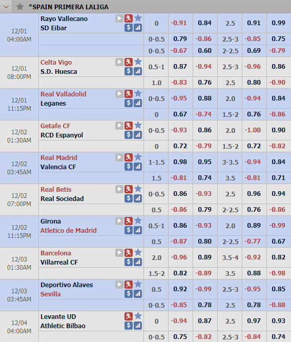 Cập nhật tỷ lệ châu Á vòng 14 La Liga Tây Ban Nha
