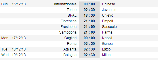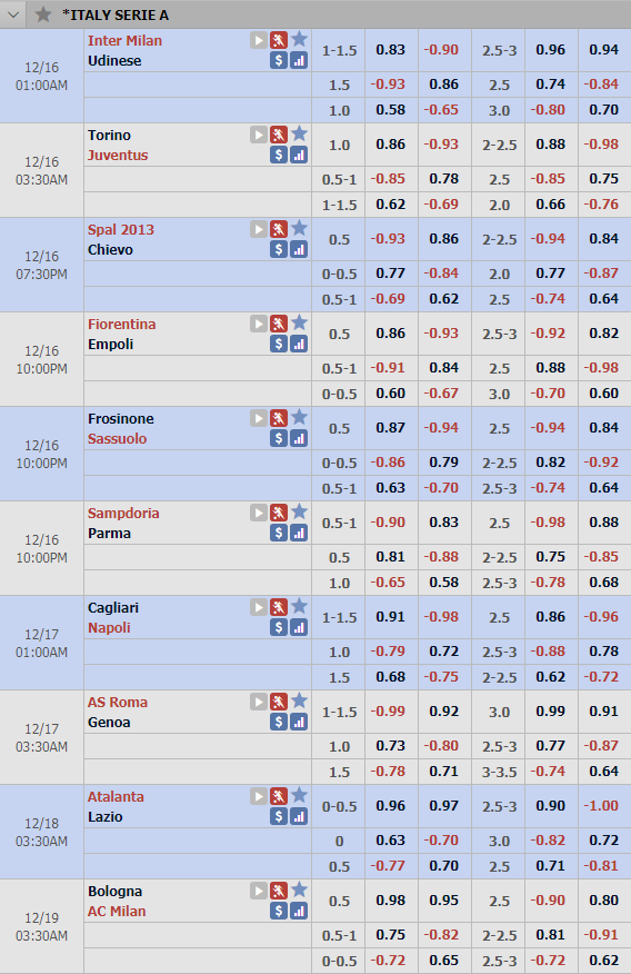 Cập nhật tỷ lệ châu Á vòng 16 Serie A Italia