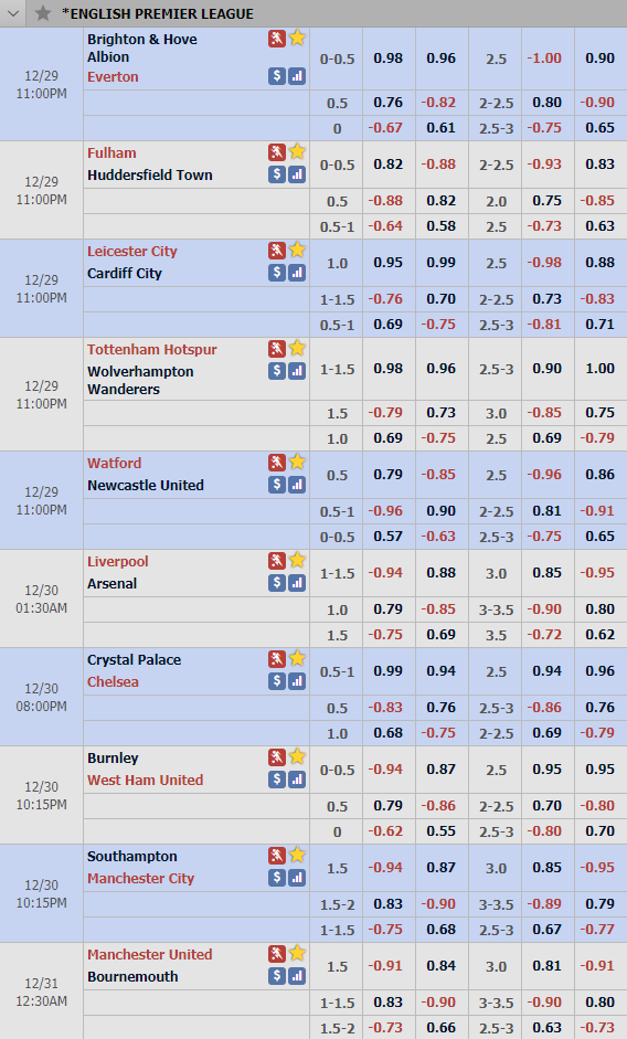 Cập nhật lịch thi đấu và tỷ lệ châu Á vòng 20 giải Ngoại Hạng Anh (Premier League)