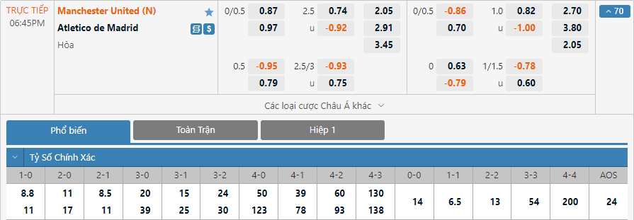 Ở bảng tỷ số chính xác của trận đấu tỷ số hoà 1-1 có điểm ăn thấp nhất với 6.5 lần, tiếp theo là tỷ số 2-1 với điểm ăn là 8.5 lần. Nhưng tỷ số 1-2 cũng không có điểm ăn quá chênh lệch với 10 lần. Với dự đoán Man Utd sẽ gặp khó trận này và trận đấu diễn ra với thế trận cởi mở hơn thường lệ thì lựa chọn tỷ số hoà 1-1 hoặc 1-2 là một lựa chọn hợp lý.